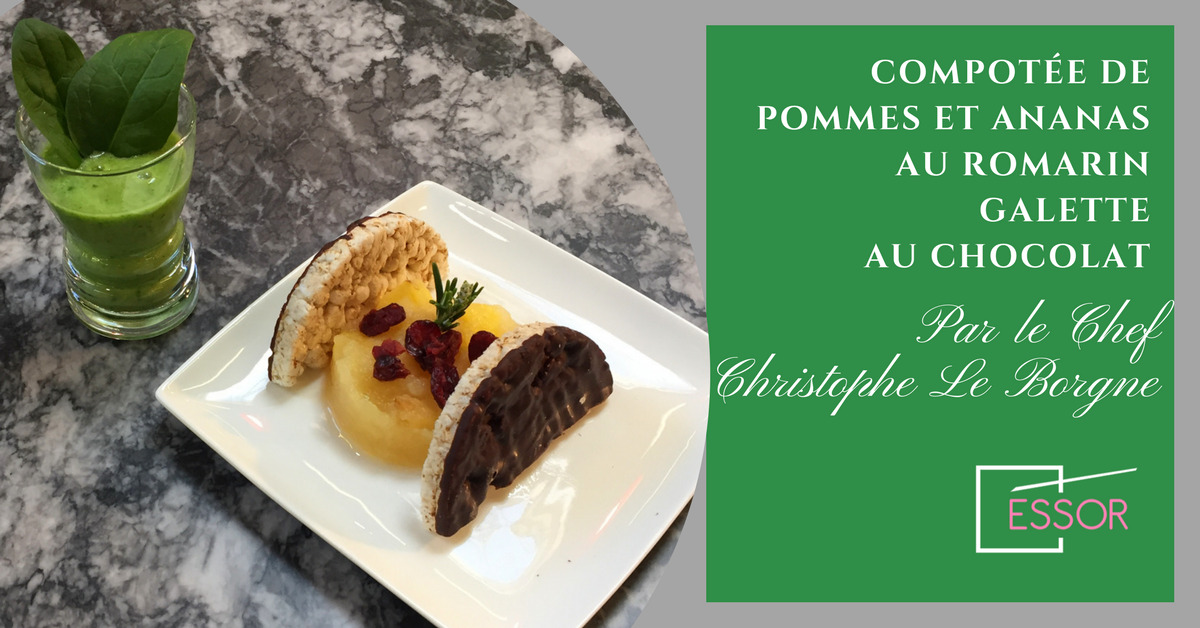 Le Chef Christophe Le Borgne, des Chefs du samedi à Essor Anglet, vous propose sa recette de compotée de pommes et ananas au romarin galette au chocolat :
